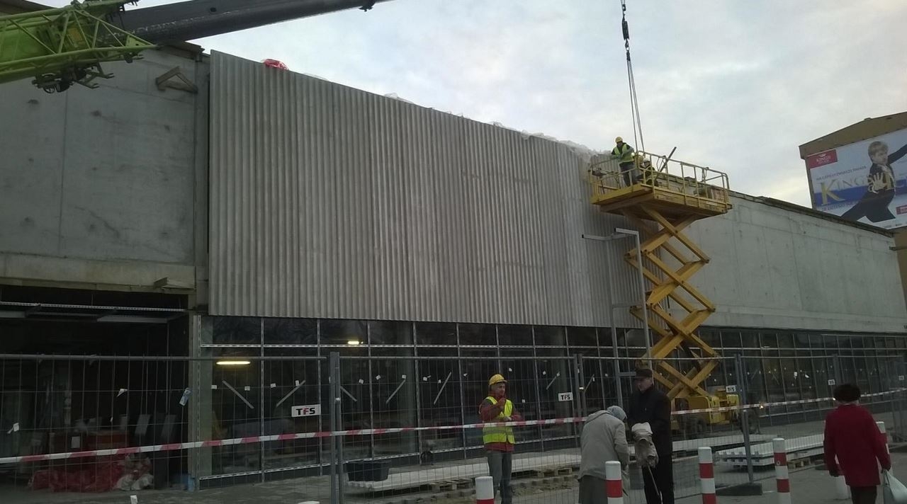 Montaż fasady z płyt z betonu elewacyjnego nowego budynku Hali Banacha przy ulicy Grójeckiej w Warszawie - ok. 1.700 m2.